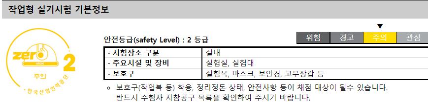 실기시험의 경우 안전등급 2등급의 시험으로 보호구 및 수험생 지참공구 목록을 확인하여 꼭 시험 때 지참하셔야 감점이 없으니 챙겨가시길 바랍니다.