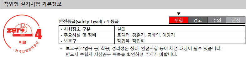 실기시험은 안전레벨 4등급의 시험으로 꼭 보호구 및 수험생 지참공구 목록을 확인하여 챙기셔야 감점을 안 당하니 꼭꼭 챙겨가시길 바라겠습니다.