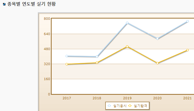 연도별 실기시험 합격률이며 2021년 기준 실기시험 응시자 수는 772명으로 그 중 합격자는 466명입니다.