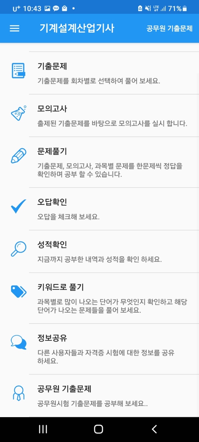 어플을 이용하면 연도별 기출문제와 모의고사 문제를 풀 수 있고 오답 확인도 가능하며, 자격증 시험에 대한 정보를 사용자들과 공유도 가능합니다.