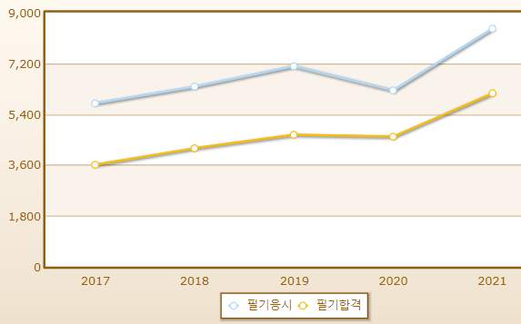 조주기능사 연도별 필기시험 합격률이며 2021년 기준 필기시험 응시자 수는 8,426명으로 그 중 합격자는 6,138명입니다.