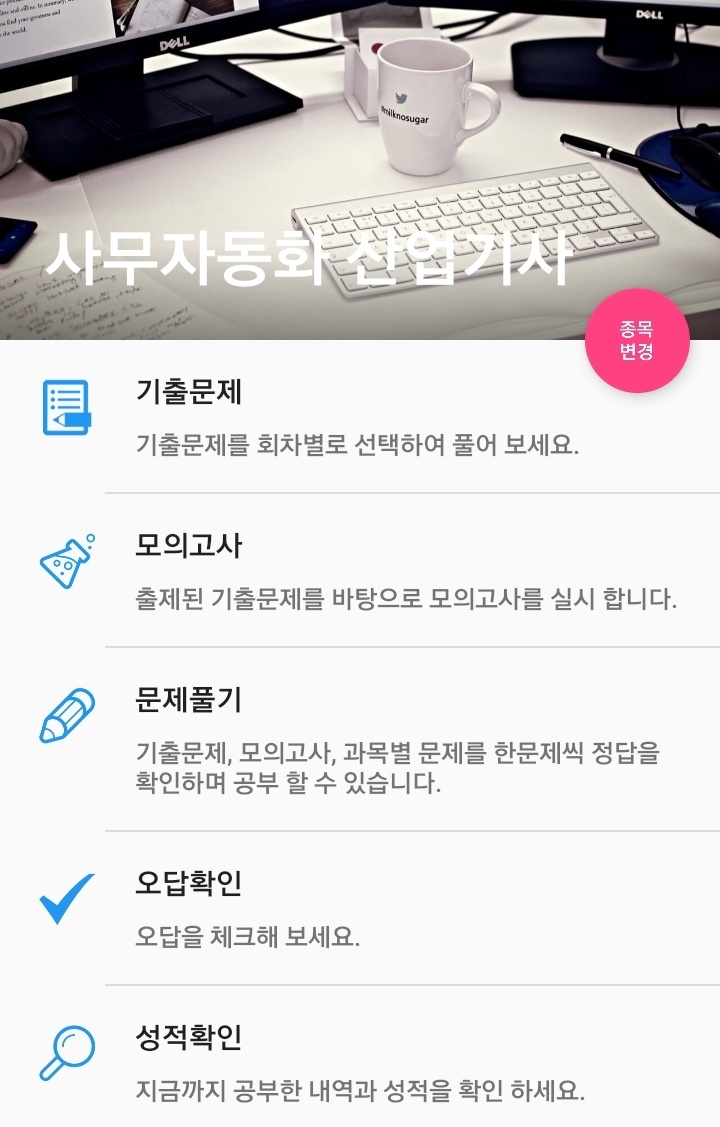 위 어플을 이용하여 연도별 필기 기출문제 풀이가 가능하고 여러 형태의 문제를 풀 수 있으며 오답 확인도 가능한 어플입니다.