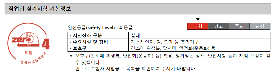 양식조리기능사 시험은 불과 칼을 쓰기 때문에 안전등급 4등급의 시험으로 꼭 보호구 및 수험생 지참공구 목록 확인하셔서 챙겨가셔야 감점을 당하지 않습니다.