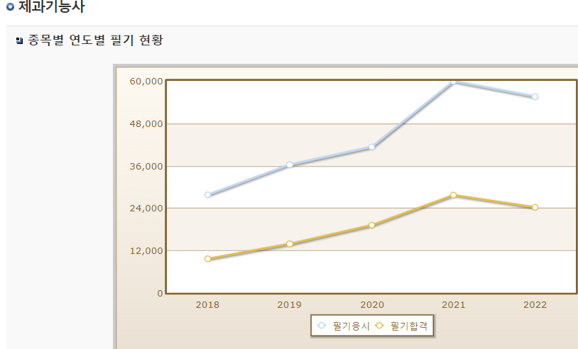 제과기능사 합격률이며 2022년도 기준 응시자 수는 55,531명으로 그 중 합격자는 24,186명입니다.
