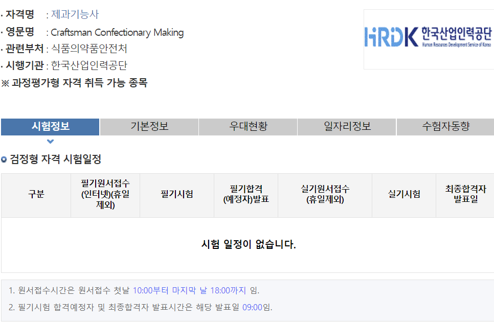 제과기능사는 상시시험으로 따로 일정은 없으며 시험일정은 아래 사진과 같으니 참고 하시면 됩니다.