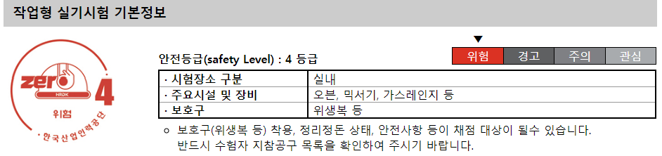 또한 제빵기능사 시험은 안전등급 4등급의 시험으로 꼭 보호구 등 수험생 지참공구 목록 확인하셔서 챙겨가시길 바랍니다.
