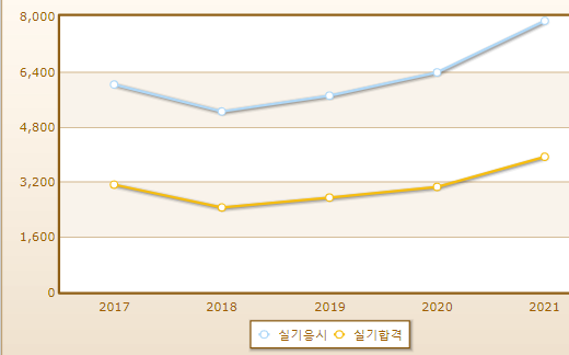 연도별 실기시험 합격률이며 2021년 기준 실기시험 응시자 수는 7,868명으로 그 중 합격자는 3,923명입니다.