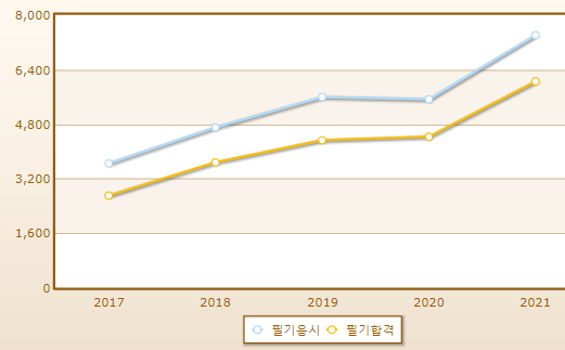 연도별 필기시험 합격률이며 2021년 기준 필기시험 응시자 수는 7,405명으로 그 중 합격자는 6,050명입니다.