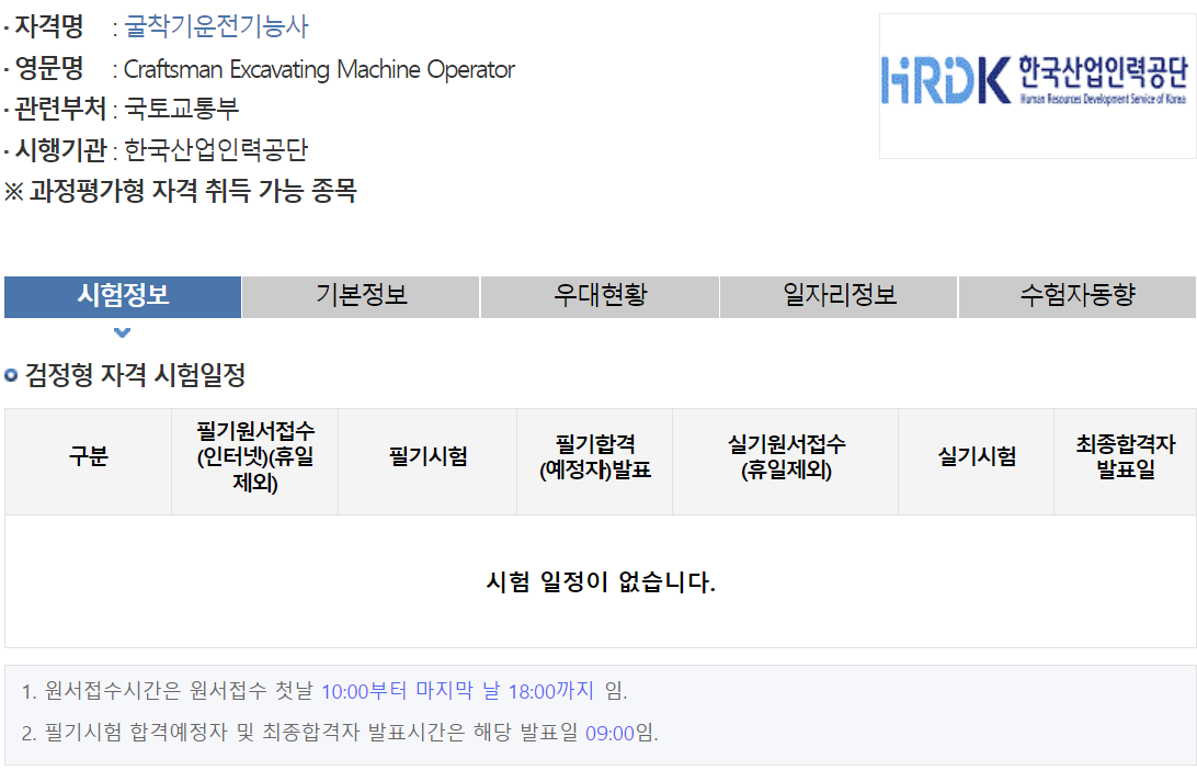 굴삭기 운전기능사 필기시험 일정