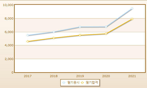 연도별 필기시험 합격률이며 2021년 기준 응시자 수는 9,451명으로 그 중 합격자는 7,890명입니다.