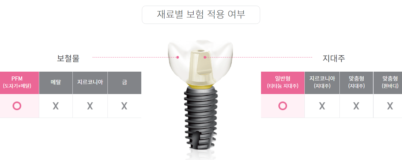 A. 안됩니다. 보철재료를 금,PFG,메탈,지르코니아 등으로 치과임플란트를 시술하게 되면 보험적용이 되지 않습니다.