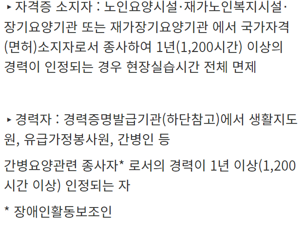 *경력자 조건" 요양보호사 2급 자격 취득 후 간병 ' 요양업무 경력 1년(1200H) 이상인 자.