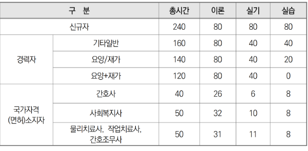 기본 신규 분이라면 이론 80시간, 실기 80시간, 실습 80시간으로 총 240시간의 교육을 이수해야 하고 *국가자격증을 소지한 분들이라면 교육 받는 시간이 줄어들게 됩니다.