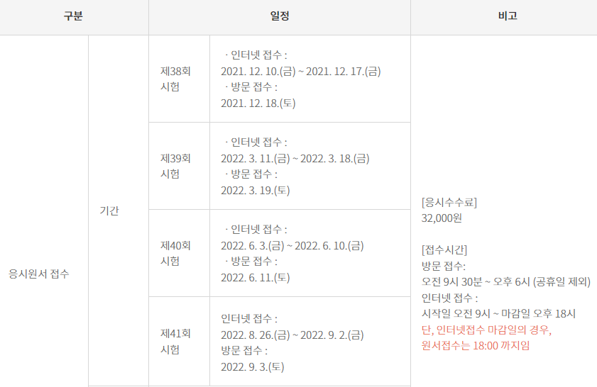 시험은 매년 4회 시행하며 올해 남은 시험은 제41회 시험이 남아 있습니다.