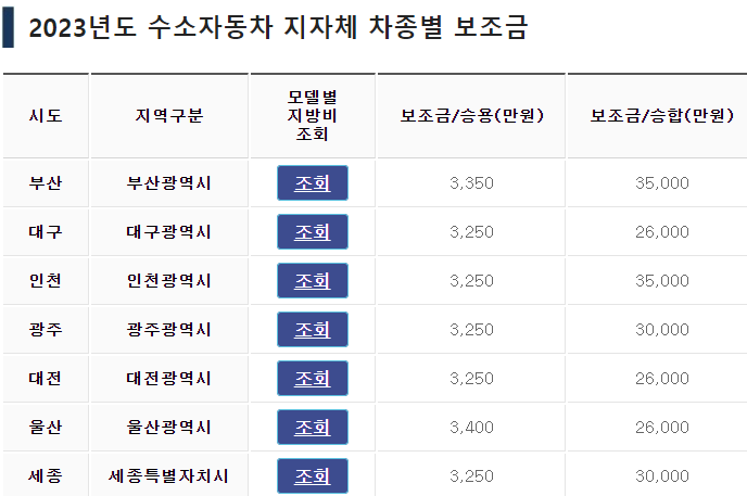 아래는 부산, 대구, 인천시, 광주광역시, 대전, 울산, 세종시. 수원시,. 의정부시. 부천시, 광명시, 평택시, 안산시, 고양시, 과천시, 구리시, 남양주시, 오산시, 시흥시, 군포시, 하남시, 파주시, 이천시, 안성시, 김포시, 화성시, 경기 광주시, 양주시, 포천시, 여주시, 양평군, 춘천시, 원주시, 강릉시, 동해시, 속초시, 삼척시, 홍천군, 횡성군, 평창군, 철원군, 양구군, 인제군, 고성군, 양양군, 청주시, 충주시, 보은군, 증평군, 영동군, 진천군, 괴산군, 음성군, 천안시, 공주시, 보령시, 아산시, 서산시, 당진시, 서천군, 청양군, 홍성군, 예산군, 전주시, 군산시, 김제시, 익산시, 완주군, 목포시, 부안군, 여수시, 순천시, 광양시, 장성군, 포항시, 경주시, 김천시, 구미시, 상주시, 문경시, 경산시, 고령군, 성주군, 울진군, 창원시, 진주시, 통영시, 김해시, 밀양시, 거제시, 양산시, 함안군 지자체별 넥소 보조금은 다음과 같습니다.