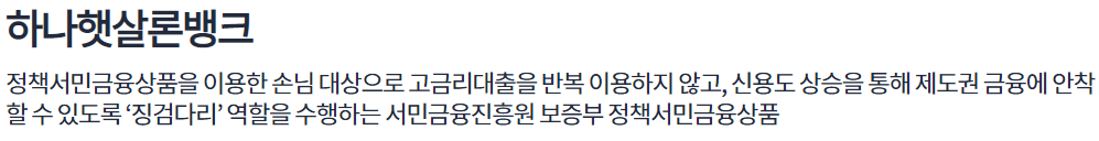 하나은행 햇살론뱅크 상품은 정책서민금융 상품인 햇살론15,미소금융,새희망홀씨 등 상품을 이용했던 분들 중에 고금리 대출 이용이 불가피한 분들에게 제도권 금융 이용을 할 수 있게 조건을 완화한 상품입니다.
