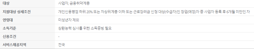 개인신용평점 및 소득이 낮아 제도권 금융 이용이 어려운 서민에게 담보 및 보증 없이 저금리로 창업자금을 대출해주는 정책입니다.