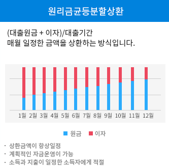 원리금균등분할상환이란 대출금 만기일까지의 총 이자 + 원금을 합하여 대출기간으로 나누어 매번 일정금액을 상환하는 방법으로 상환금액이 항상 일정하여 계획적인 자금운영이 가능해 소득 및 지출이 일정한 정액소득자에게 적절한 상환방법입니다.