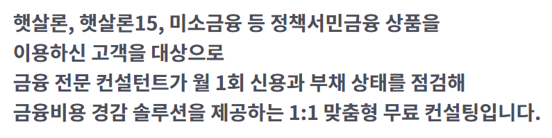 햇살론, 햇살론15, 미소금융 등 정책서민금융 상품을 이용하신 고객을 대상으로 금융 전문 컨설턴트가 월 1회 신용과 부채 상태를 점검해 금융비용 경감 솔루션을 제공하는 1:1 맞춤형 무료 컨설