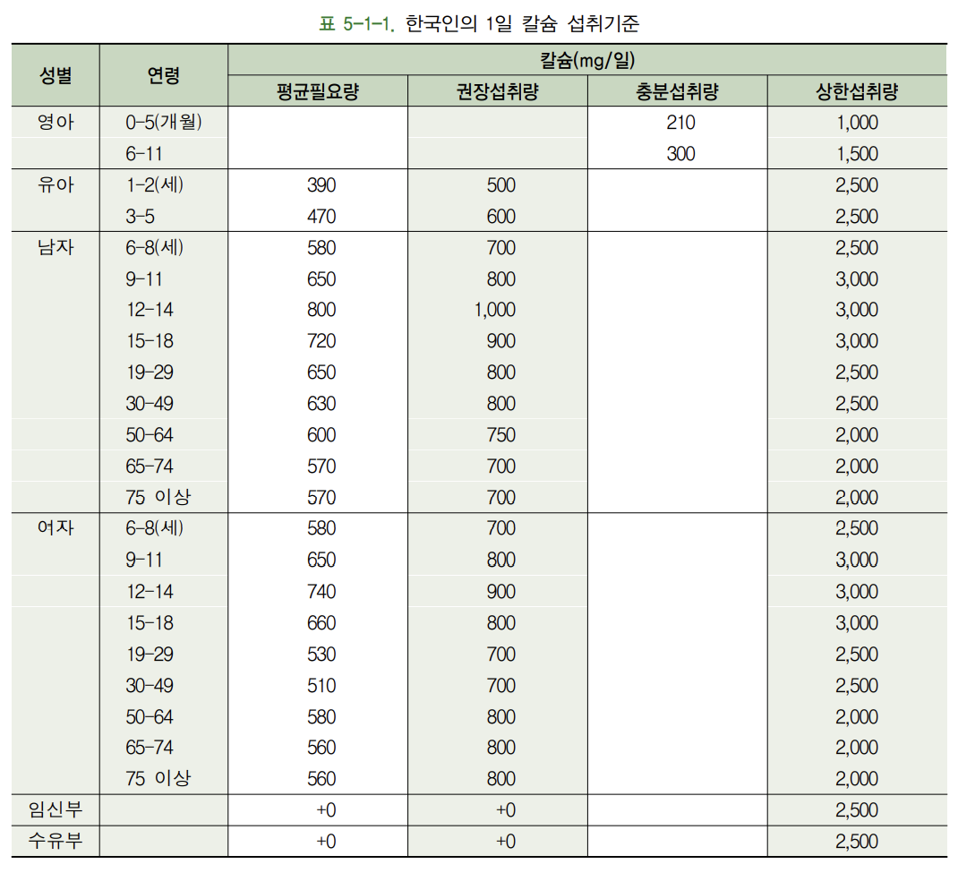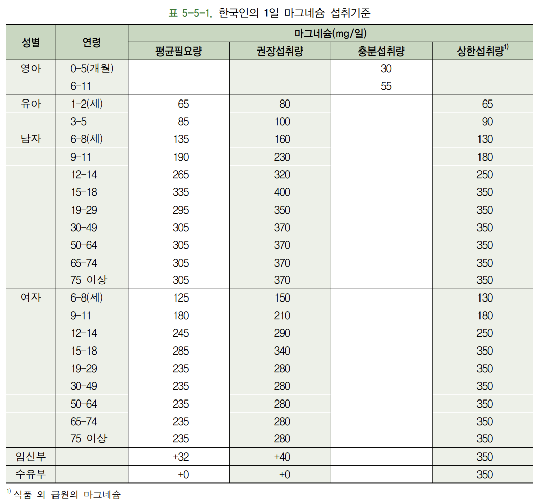 마그네슘 1일 섭취 기준은 다음과 같습니다.