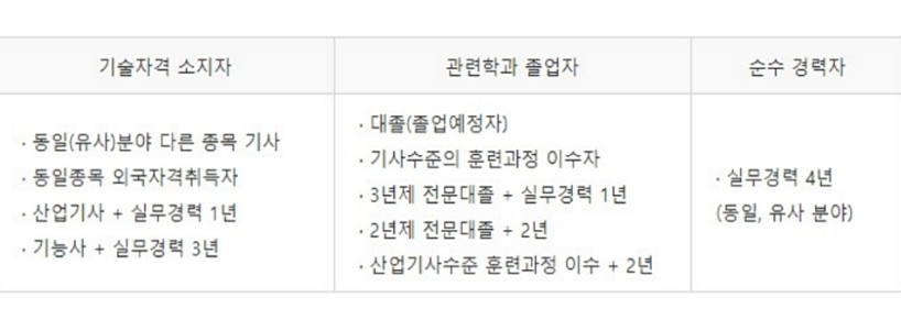 응시자격은 세가지조건으로 기술자격 소지자, 관련학과 졸업자, 순수 경력자로 나뉩니다.