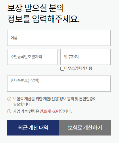 먼저 성함, 주민번호, 휴대폰 번호 입력 후 보험료 계산하기를 클릭합니다.