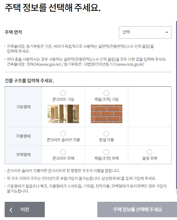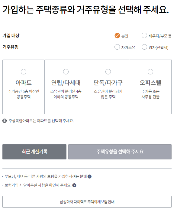 보험료 조회는 주택종류 및 거주유형 ,주택 정보등을 입력하면 간단하게 보험료 조회가 가능합니다.