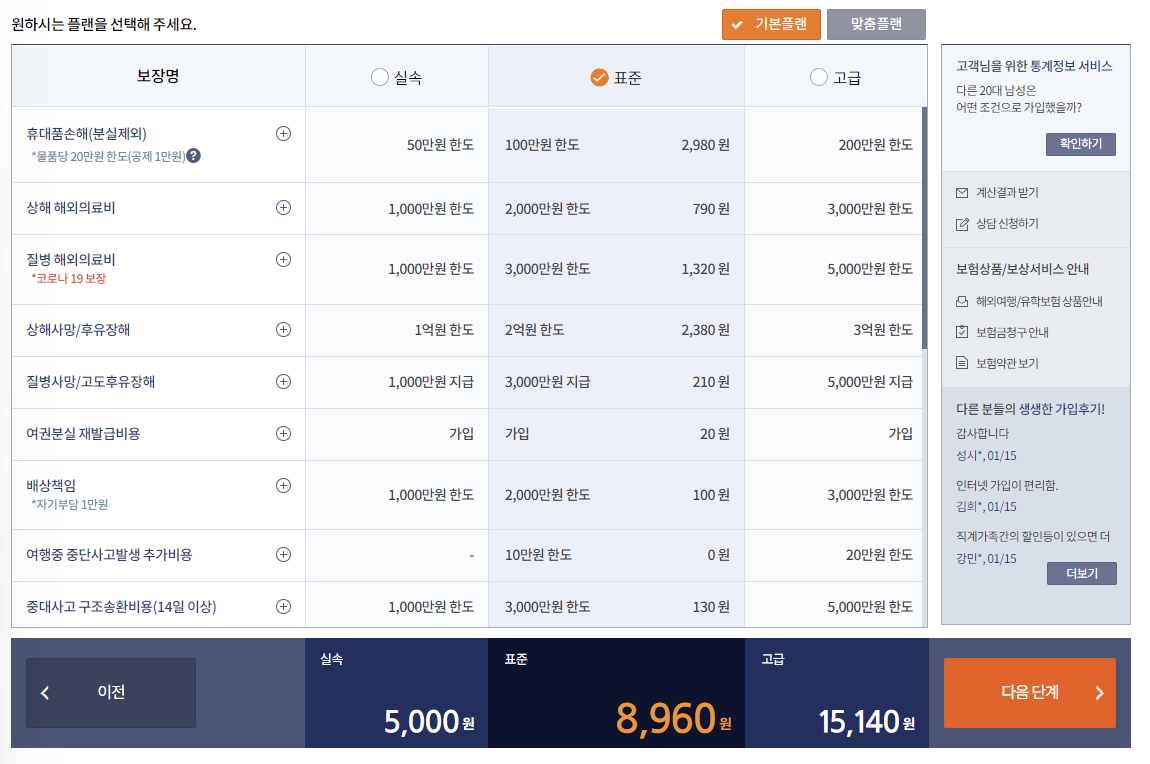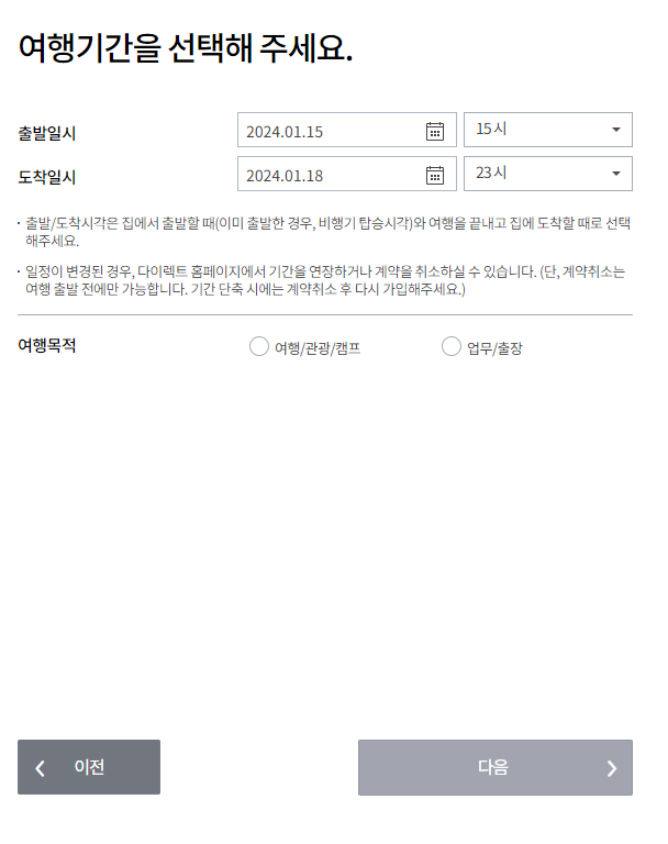 여행기간 및 여행의 목적을 입력하시면 됩니다. 그러면 아래와 같이 보험료가 나오며 보험료는 보장 플랜에 따라 달라지니 직접 조회해보시기 바랍니다.