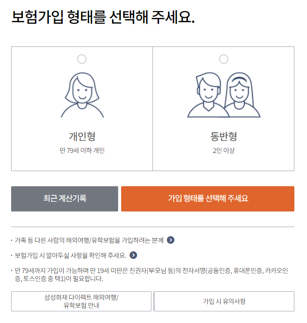 보험료 조회는 간단하게 가능합니다. 개인 또는 동반형 선택 해주세요.
