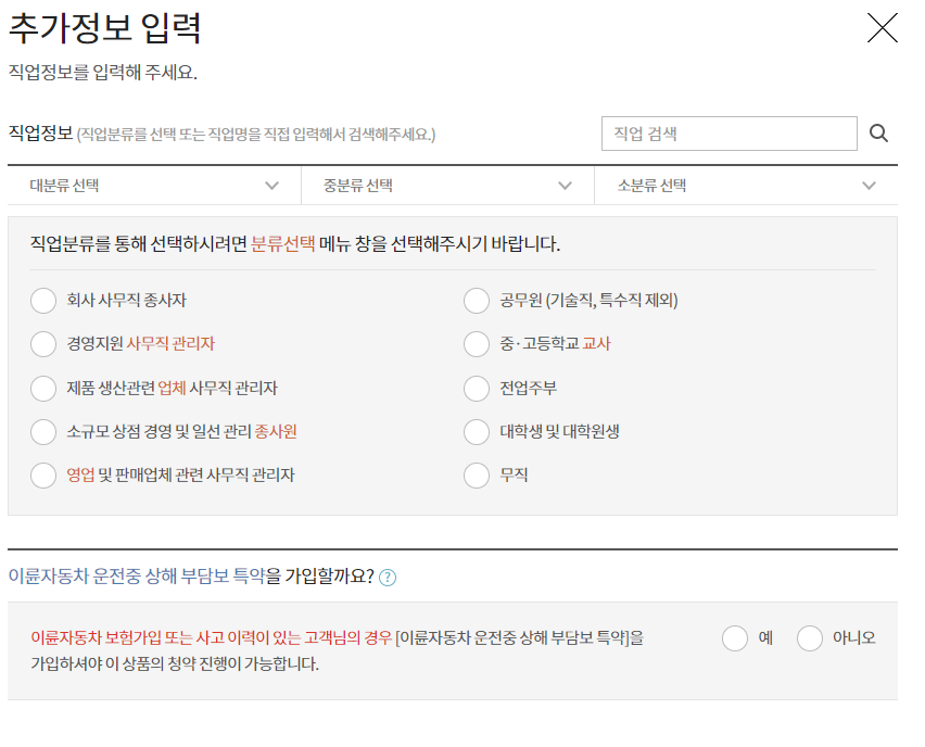 본인인증은 원하는 방법으로 인증하시면 됩니다. 인증 후 아래 직업정보 및 이륜자동차 운행 관련하여 입력해야 합니다.