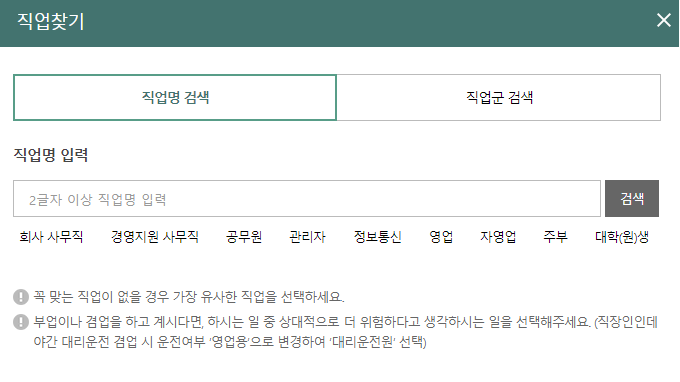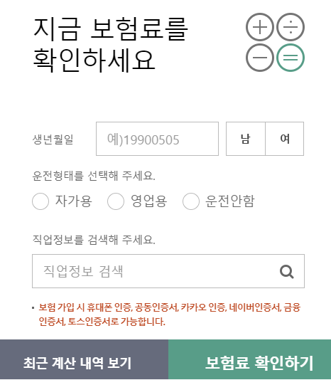 우선 생년월일 성별 운전여부와 직업정보를 입력합니다.