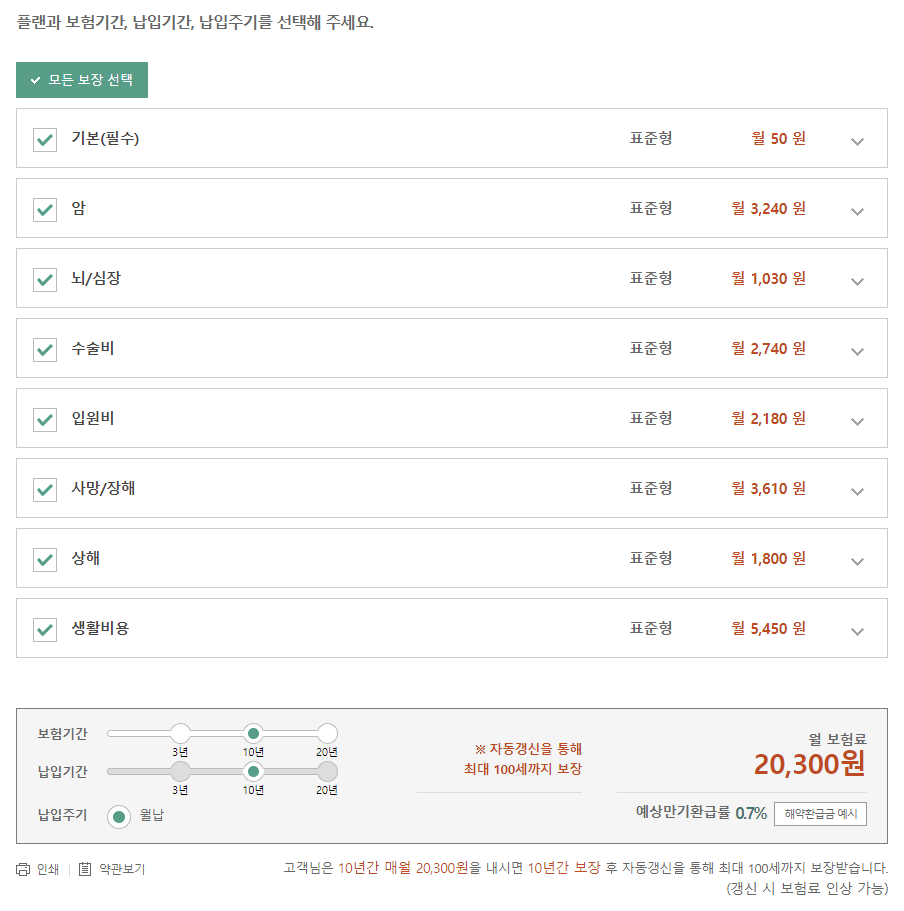 보험료는 플랜 및 납입기간, 납입주기 등에 따라 달라지므로 자세한 보장 등은 직접 입력해보면서 마음에 드는 부분을 보장 받을 수 있도록 선택하시고 비교해보시기 바랍니다.