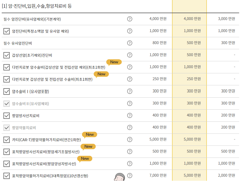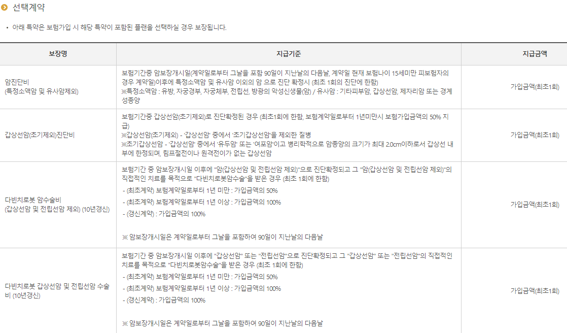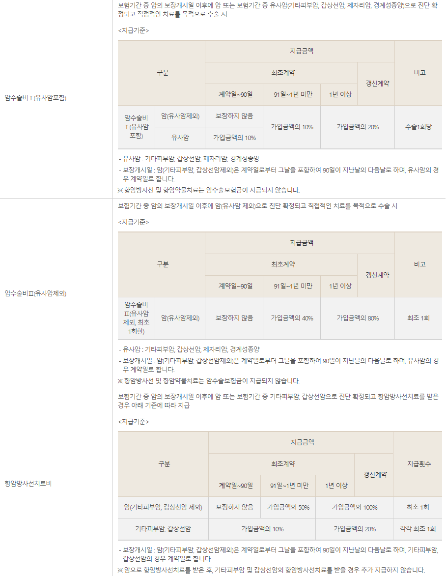 | 유사암진단비[갱신계약] | 보험기간 중 기타피부암, 갑상선암, 제자리암, 경계성종양으로 진단확정 시(보험가입 후 1년 미만에 진단확정 시 50% 지급, 각각 최초1회 지급) | 가입금액 |