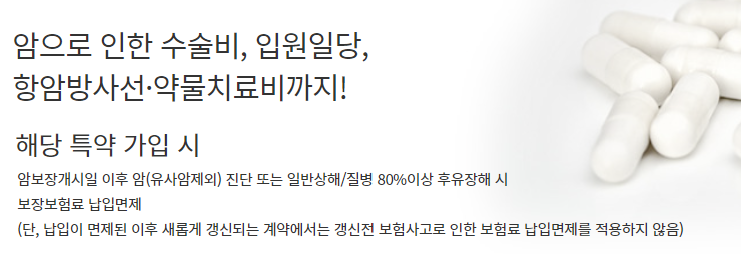 | 보험료납입면제대상보장(3대)[갱신계약] | 보험기간중 아래사항 중 어느 한가지의 경우에 해당되는 때에 이 특별약관의 보험가입금액을 보험료납입면제대상보장(3대) 보험금으로 지급(최초1회한) ① 일반상해80%이상후유장해시 ② 질병80%이상후유장해시 ③ 암보장개시일(계약일로부터 그날을 포함하여 90일이 지난날의 다음날)이후에 암(유사암 제외)으로 진단확정된 경우 |