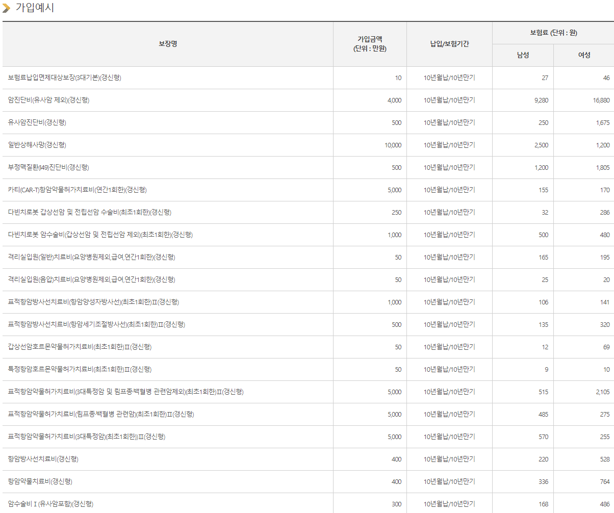 위 보험료는 가입예시기준으로 산출된 보험료로서 가입자의 성별, 연령 및 직종, 납기/만기 등에 따라 달라질 수 있음을 알려드립니다.