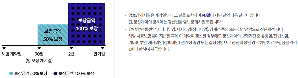 1. 암보장개시일은 최초계약의 경우 계약일로부터 그 날을 포함하여 90일이 지난 날의 다음 날로 하고 갱신계약의 경우 갱신일로 합니다. 다만, 부활(효력회복)계약의 암보장개시일은 부활(효력회복)일을 포함하여 90일이 지난 날의 다음 날로 합니다.