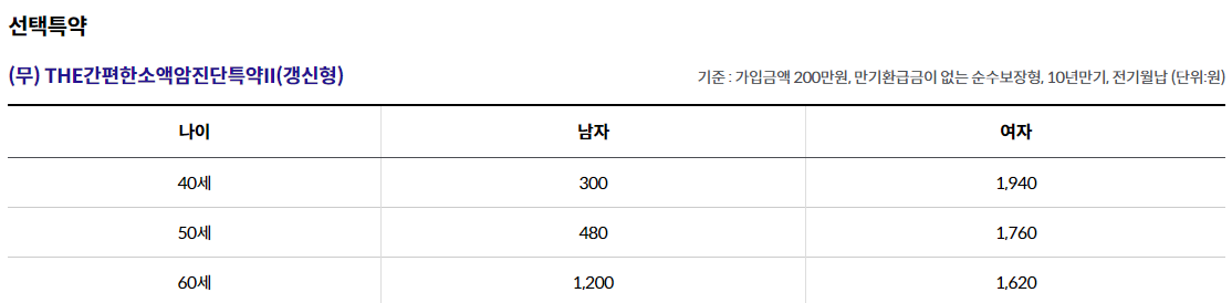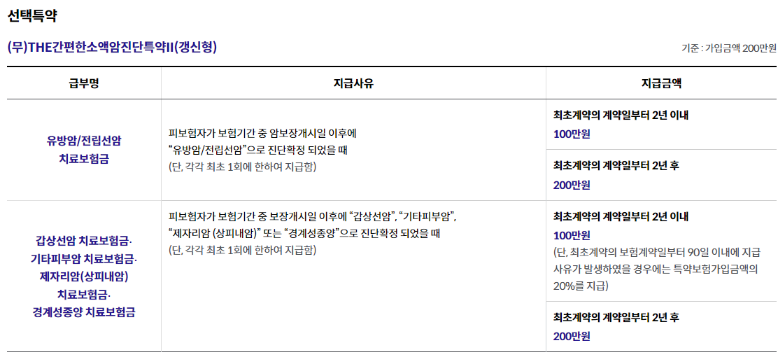 - (무)THE간편한소액암진단특약Ⅱ(갱신형) 200만원 가입시,"유방암", "전립선암"은 가입 후 91일째부터 보장, 2년 이내 진단시 50% 보장