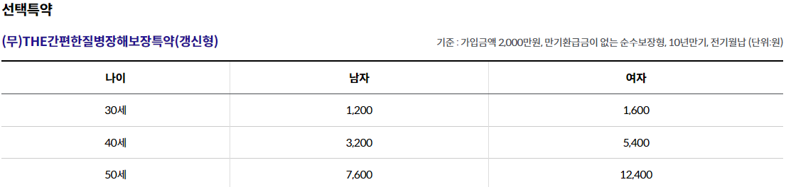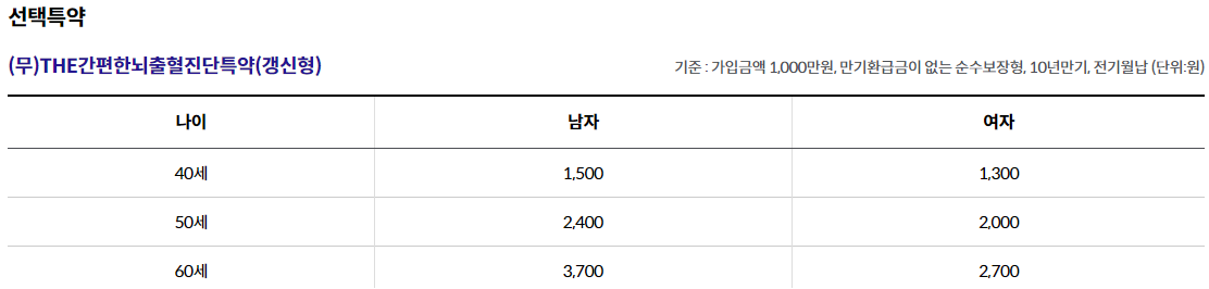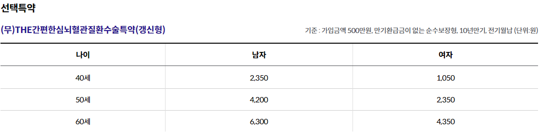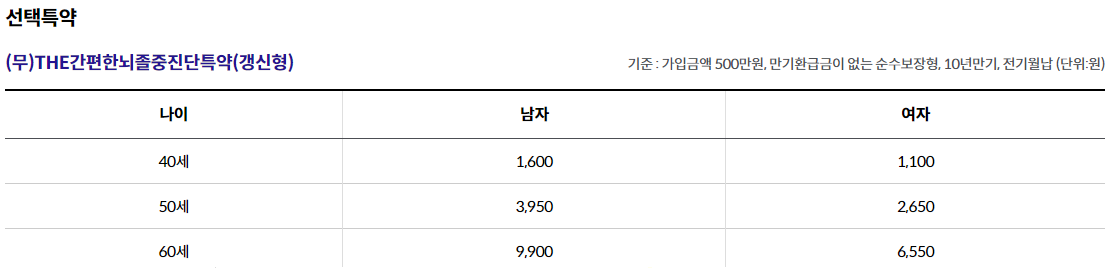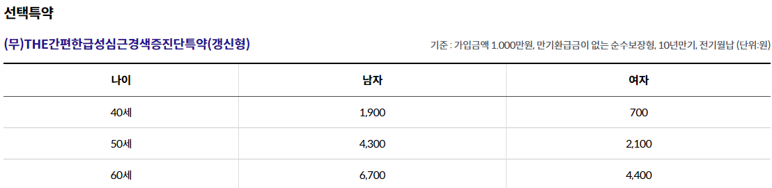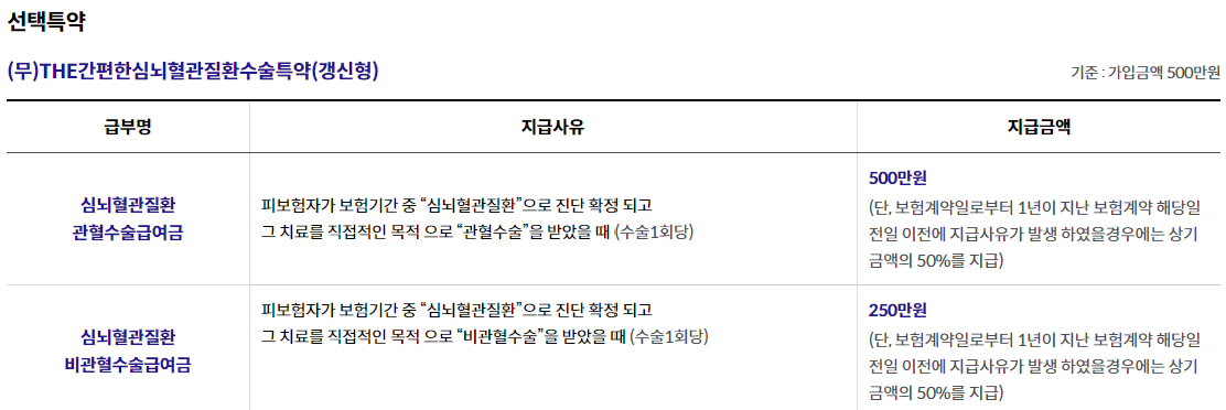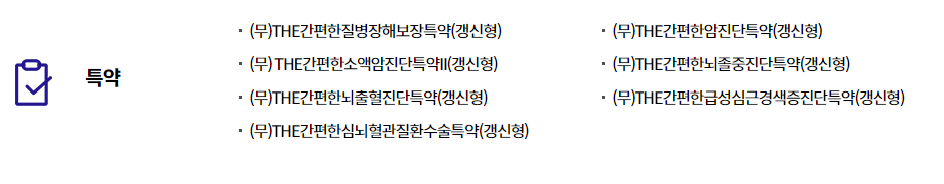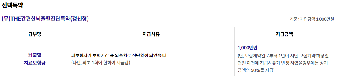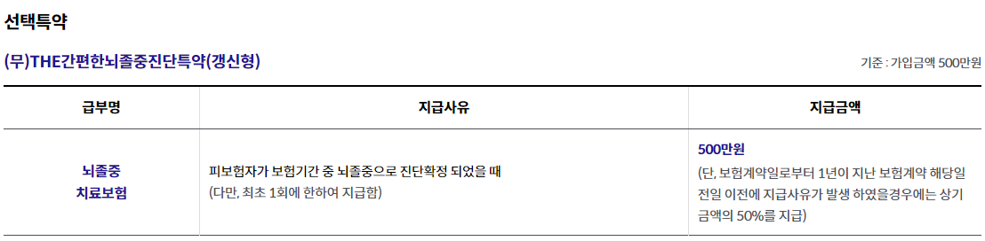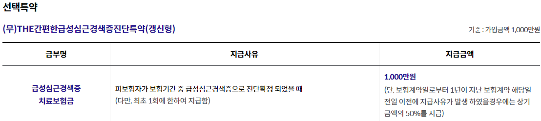 - THE간편한급성심근경색증진단특약(갱신형) 1,000만원, THE간편한뇌출혈진단특약(갱신형) 1,000만원, THE간편한뇌졸중진단특약(갱신형) 500만원 가입시, 1년 이내 진단시 50% 보장