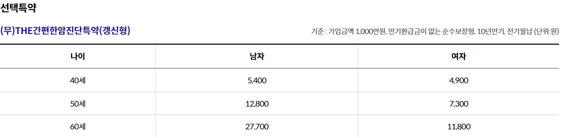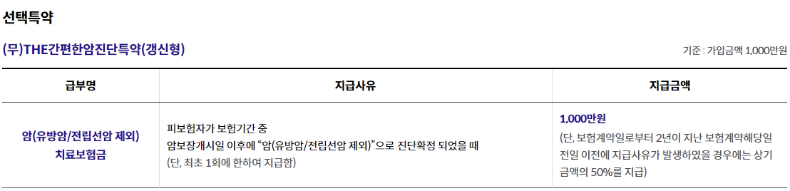 - (무)THE간편한암진단특약(갱신형) 1,000만원 가입시, 가입 후 91일째부터 보장, 2년 이내 진단시 50% 보장