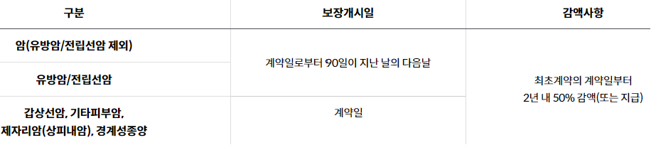 1. 암보장개시일은 최초계약의 경우 계약일로부터 그 날을 포함하여 90일이 지난 날의 다음 날로 하고 갱신계약의 경우 갱신일로 합니다. 다만, 부활(효력회복)계약의 암보장개시일은 부활(효력회복)일을 포함하여 90일이 지난 날의 다음 날로 합니다.