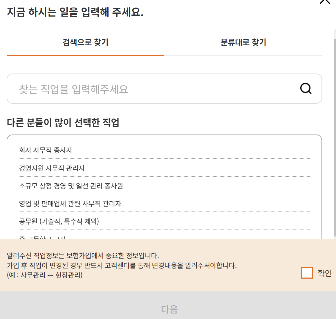 먼저 생년월일 및 성별을 입력하면 그 다음 직업정보를 입력해야 합니다.