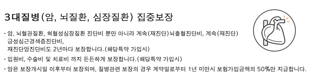 - 3대 질병(암, 뇌졸중, 심근경색)에 걸리면 최대 1억원의 보험금을 받을 수 있습니다. 만약, 3대 질병 중 하나에 걸린 적이 있으면, 나머지 두 가지 질병에 대해서도 보험금을 받을 수 있습니다.