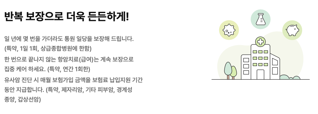 - 장기할인특약: 10년 이상 계속 납입하면 최대 10%까지 보험료를 할인해줍니다.