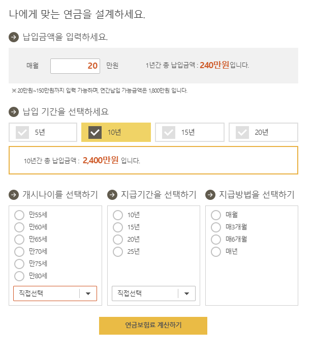 최소 보험료는 20만원부터 가능하며 20만원 기준으로 10년 납입 해서 나온 산출 보험계산료는 다음과 같습니다.