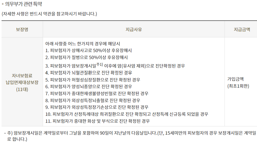 자녀보험은 부모가 아이를 위해 납입하는 보험이므로, 부모가 납입을 멈추면 아이의 보장도 중단됩니다. 그러나 부모가 상해나 질병으로 인해 납입을 할 수 없게 되면 어떻게 될까요? 이런 경우를 대비하기 위해 자녀보험에는 납입면제 사유라는 것이 있습니다. 납입면제 사유란 부모가 특정한 상황에 놓이게 되면 납입을 멈추더라도 아이의 보장이 유지되도록 해주는 조건입니다. 납입면제 사유는 상해나 질병의 정도, 암이나 유사암, 뇌혈관질환이나 허혈성 심장질환 등으로 다르게 적용됩니다. 따라서 자녀보험을 가입할 때는 납입면제 사유의 범위와 조건을 잘 확인하고 넓은 범위의 납입면제 사유를 제공하는 상품을 선택하는 것이 좋습니다.