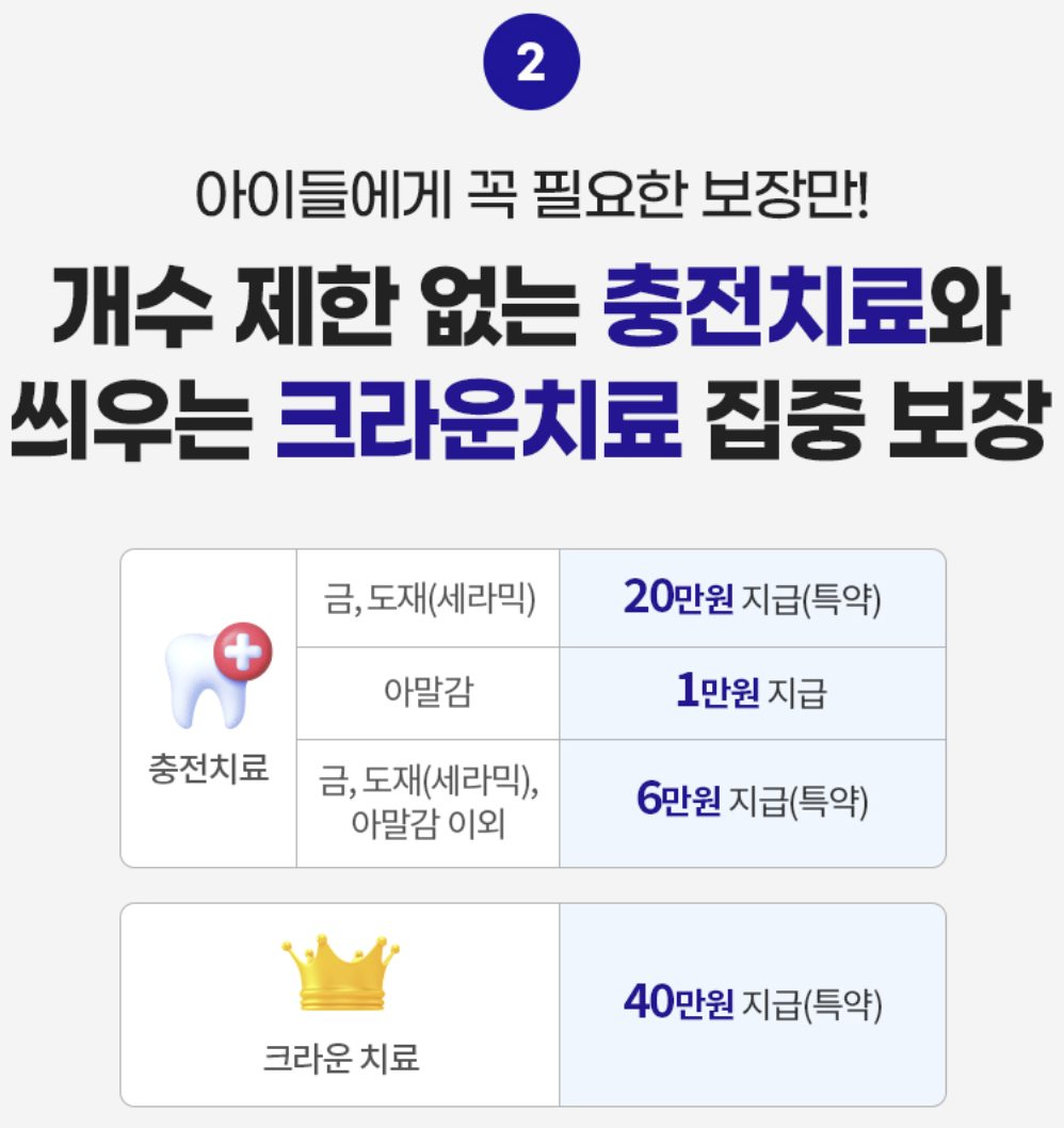 어린이치아보험은 보험금액과 치아 갯수에 따라 보장 범위가 달라집니다. 예를 들어, 한 개의 치아에 대해 여러 가지 치료를 받는 경우, 보험금액이 큰 한 가지 항목만 보장해줄 수도 있습니다. 또한, 사랑니나 이미 보철된 부위는 보장하지 않는 경우가 많습니다. 따라서, 가입하려는 상품의 보장금액과 치아 갯수를 잘 확인하고 비교해야 합니다.