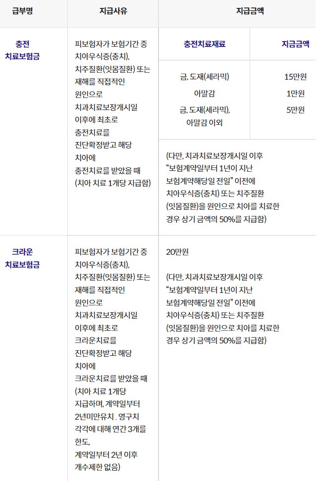· 동일한 치아에 대하여 동시에 충전치료, 크라운치료 중 두 가지 이상의 치과치료를 포함하는 복합형태의 치료를 받은 경우 해당 치료보험금 중 가장 높은 한가지의 해당 치료보험금을 지급합니다.