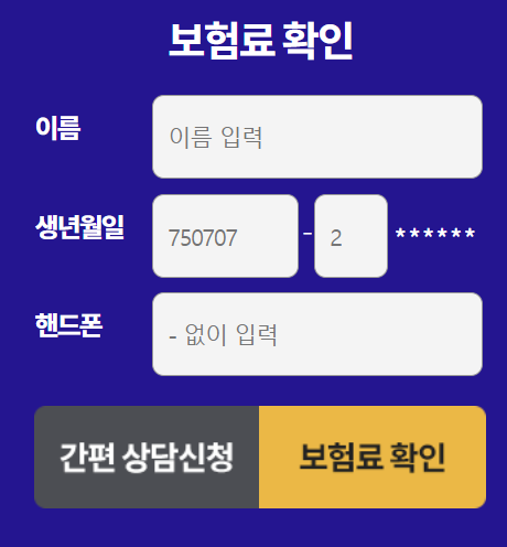 보험료 조회방법은 간단합니다. 이름, 생년월일, 핸드폰 번호 입력 후 보험료 확인을 클릭합니다.