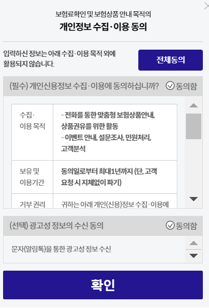 보험료 확인을 위한 개인정보 수집 및 이용에 동의 후 확인을 클릭하면 아래와 같이 보험료가 계산됩니다.