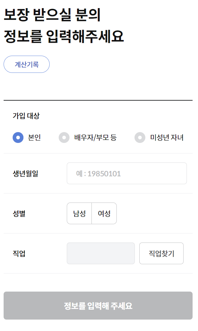 보험료 조회방법은 간단합니다. 가입대상 및 생년월일, 성별, 직업 입력 후 보험료 계산하기를 클릭합니다. 그럼 다음과 같이 바로 보험료가 조회됩니다.